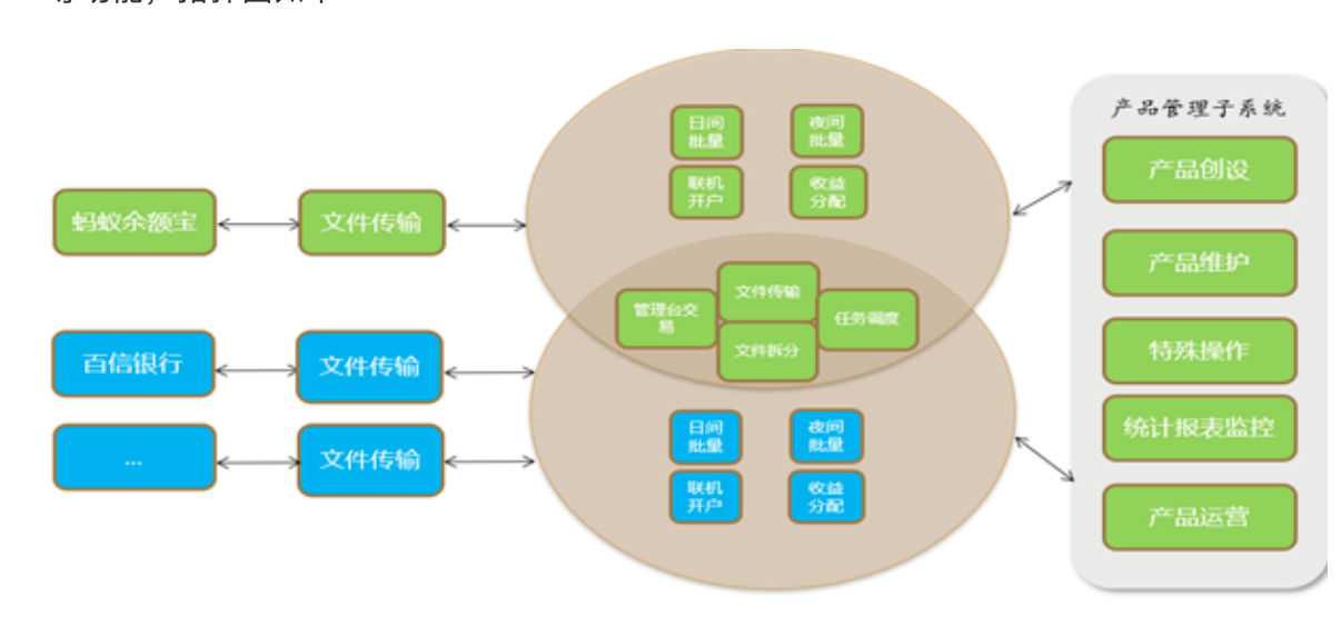互联网理财系统主要包含文件传输、实时开户、交易确认、份额登记、收益结转、产品管理、产品运营等功能,拓扑图如下: