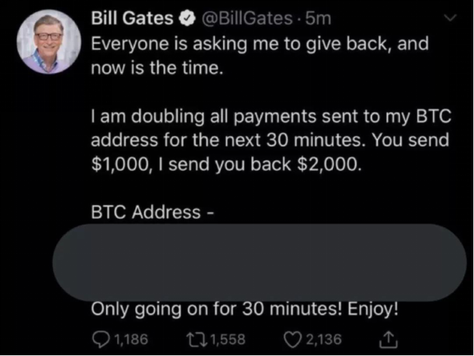 比尔盖茨道:“大家都叫我回馈社会,好吧。我要在接下来的30分钟内双倍奉还比特币账号上的钱给大家,你给我1000美元,我就转还2000美元给你。我的比特币账号是——”