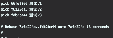 执行命令后可以看到刚才提交的3次commit已经出现,这里pick代表选中,这里需要pick一次commit,对另外两个commit执行squash操作,squash翻译为压入,塞入,合并