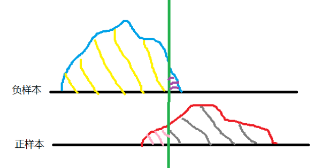 下图中绿色代表阈值,黄色是TN,紫色FP,粉色FN,灰色TP