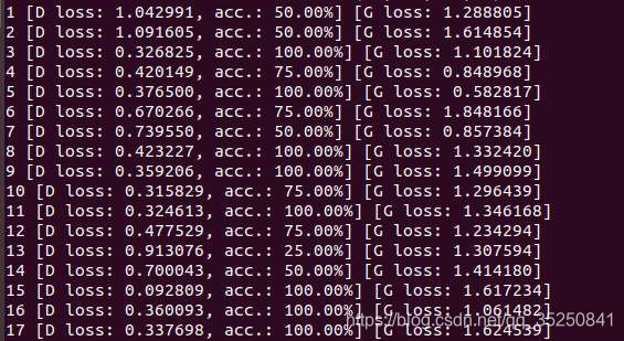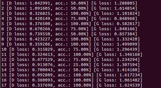 此处关于SGD batchsize设定问题,建议最小不要小于32,而且最好不要考虑通过减小batchsize同步减小lr的方式来加速训练。原因是GAN中的判别器训练评估方式是分类问题的评估方式,就是对一张图片打分然后按照是否高于一个阈值来判断类别,也就是说acc的值变化的最小范围就是1/batchsize. 下面以mmist训练为例,我把batchsize设定为4时候的输出如下