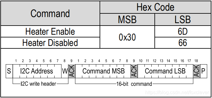 SHT3x配备了内部加热器,但仅用于可靠性检查。加热器可以通过命令开关,控温范围大约在几度范围之内。其状态可在状态寄存器中查看,默认加热器是关闭。器操作命令如下: