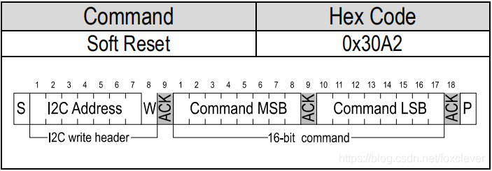 对于SHT3X来说系统复位包括的内容比较多,有接口复位、软件复位、广播复位和硬件复位引脚复位。这里我们需要考虑的主要是软件复位,其操作方式如下图: