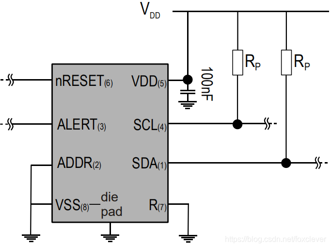 SCL和SDA线都是开放式I/O,带有到VDD和VSS的二极管。它们应该连接到外部上拉电阻。I2C总线上的设备必须只驱动线路到地面。外部上拉电阻必须把信号高。上拉电阻可能包括在微控制器的I/O电路中。SHT3x系列温湿度传感器接线方式如下图: