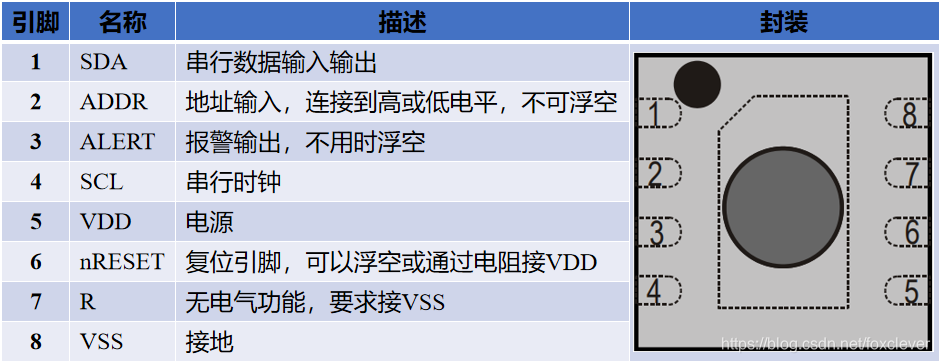 SHT3x建立在全新和优化的CMOSens®芯片之上,进一步提高了产品可靠性和精度规格。SHT3x提供了一系列新功能,如增强信号处理、两个独特和用户可选I2C地址、一个可编程温湿度极限的报警模式,以及高达1 MHz的通信速度。SHT3x系列温湿度传感器的引脚排布及说明如下图所示: