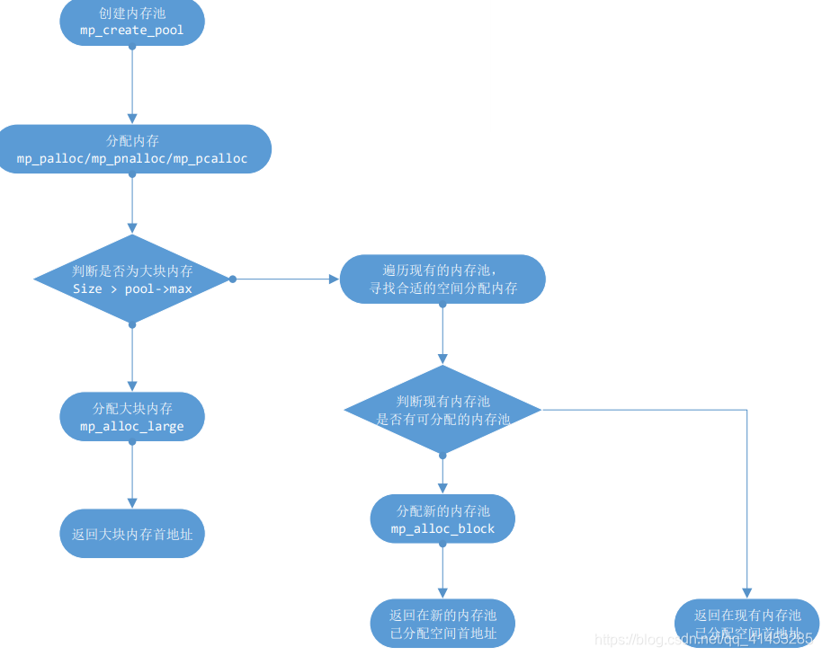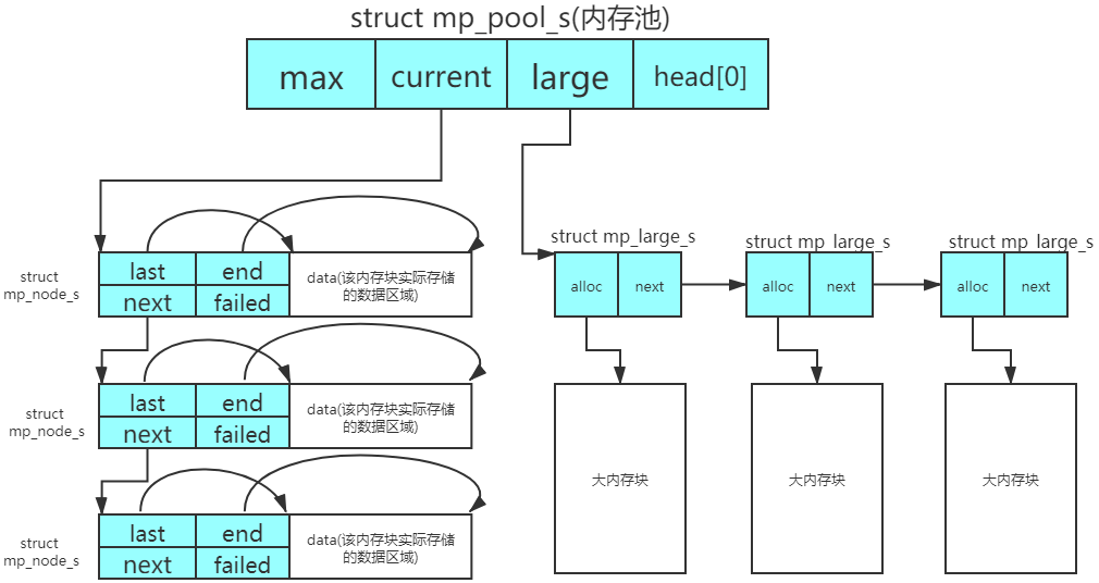 //大内存块节点 struct mp_large_s { void *alloc; //指向该大内存快的实际存储区域 struct mp_large_s *next; //指向下一块大内存快 };