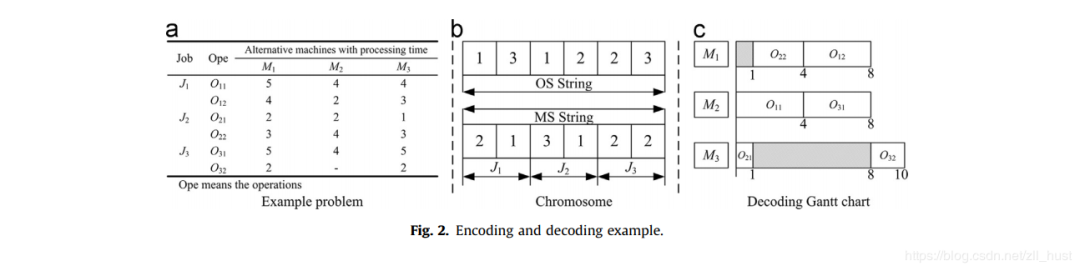 表c用甘特图表示了表b中编码解码出的一个可行解。