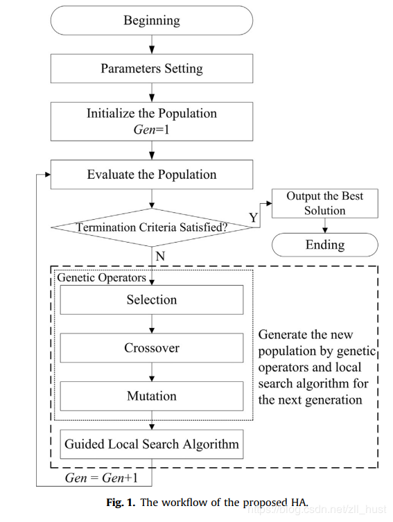 算法总体的流程如上图所示,简单来说就是在GA的过程中,对每一个子代个体进行tabu search优化。下面小编分别对GA部分和TS部分进行讲解。