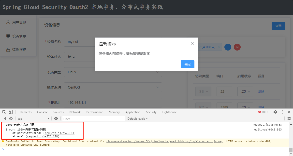 2、提交设备信息后效果如下所示显示我们刚才自定义异常信息: