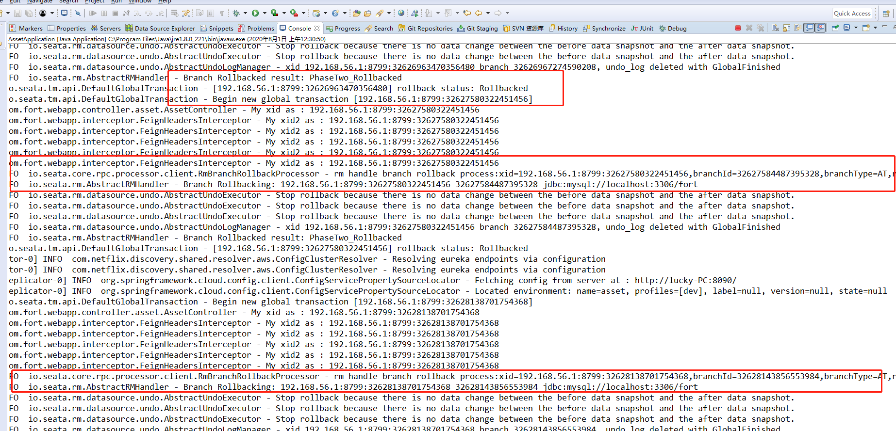 3、分别查看授权服务、设备服务分布式事务回滚日志信息如下所示: