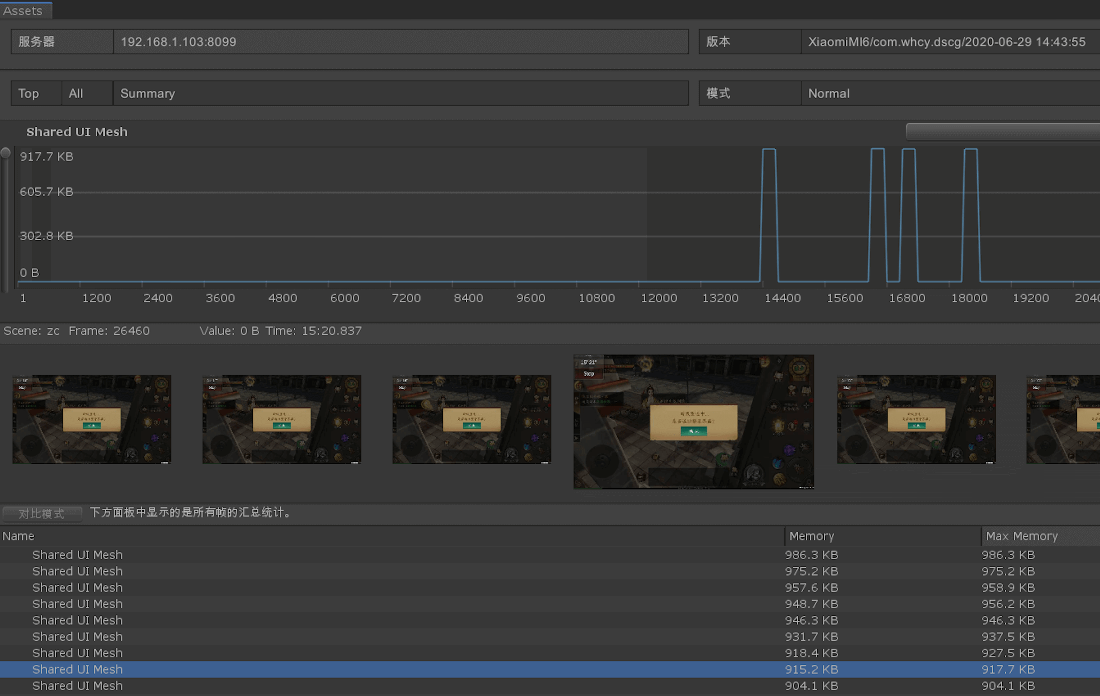 隐藏缓存池中的UI时,Shared UI Mesh内存占用: