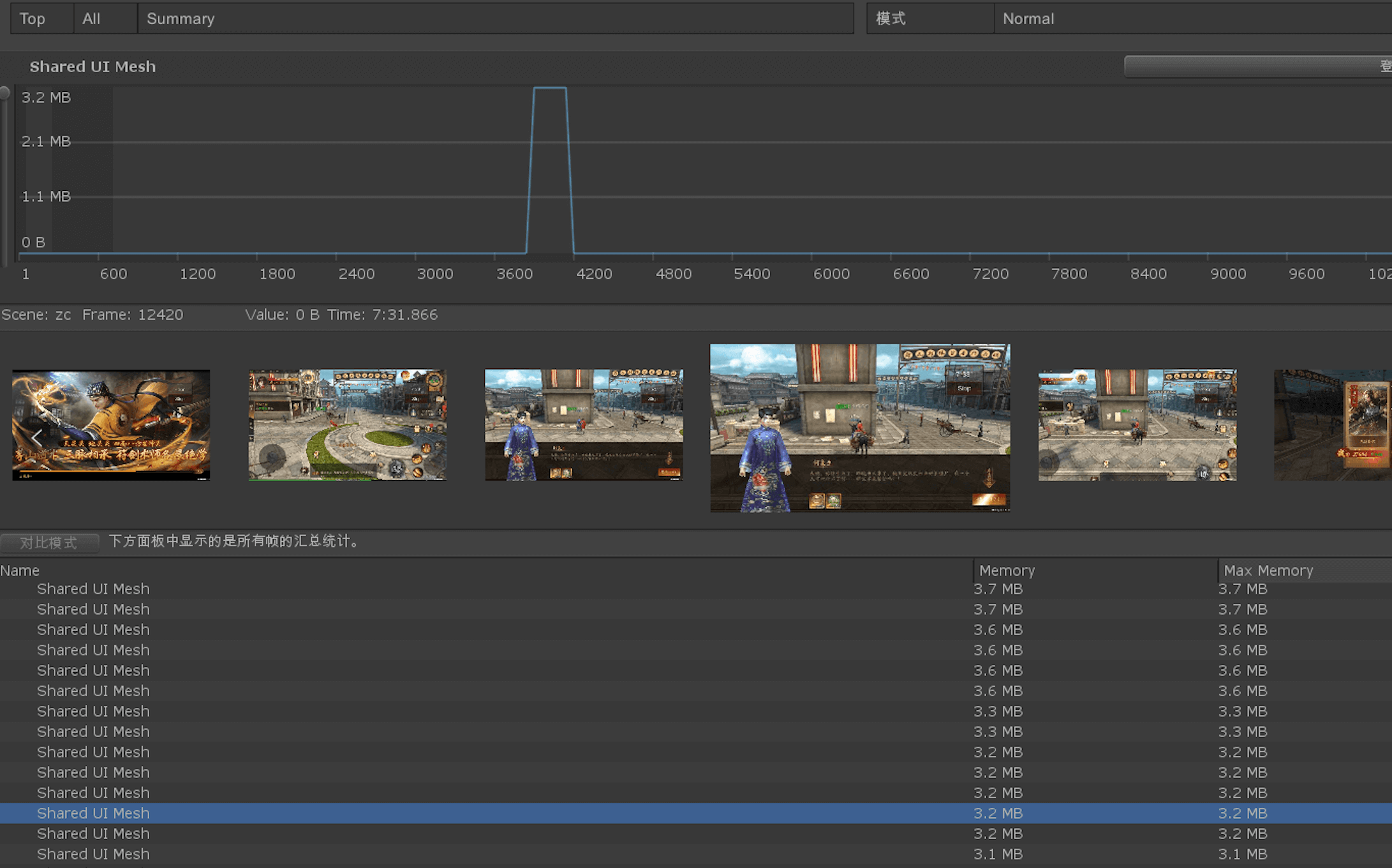 不隐藏缓存池UI时,Shared UI Mesh内存占用: