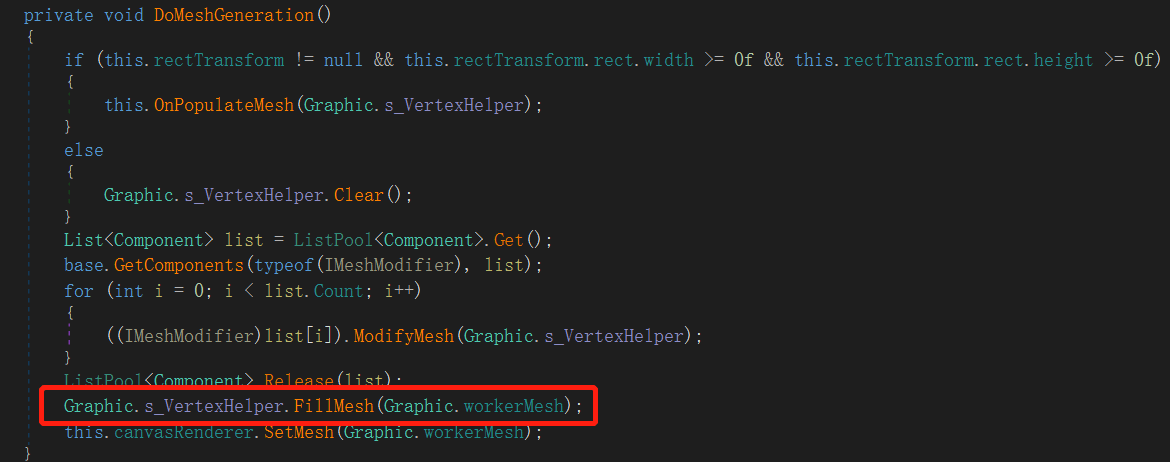 该函数是在Rebuild单个UI元素的顶点信息,红框里的FillMesh就是将更新后的顶点属性数组设置到workerMesh上,且每次调用都会先进行Clear操作。