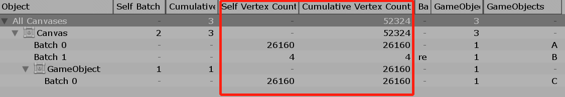 - 通过Profiler的UI面板,查看各个Canvas下各个Batch产生的顶点数,并检查对应的GameObject即可。