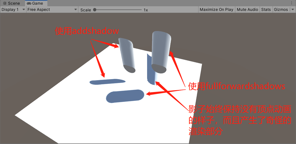 从上面的截图可以看到addshaow模式是可以让阴影保持正确的。上图中奇怪的部分应该是由于Camera产生的深度图(根据顶点变化后的物体生成)和Light生成的深度图(根据顶点变化前的物体生成的)对比的对象不一致导致的。