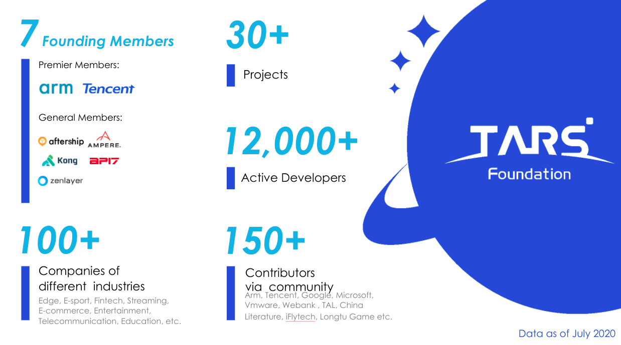 除了 TARS 项目本身,TARS 基金会也在快速发展,成立的这几个月间,已经汇聚了超过 30 个开源项目、7 家成员组织,以及获得了覆盖游戏、视频直播、互联网工具、娱乐、交通、社交网络与金融等领域 100+ 家公司/企业的采用。