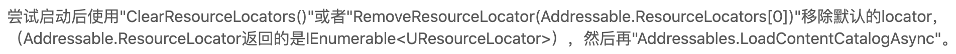 Q:项目使用Addressable做资源管理,资源更新方面因为原来有一套下载更新流程,就不使用Remote功能,全部Group都是cannot change post release。只是单纯用Addressable打包,然后比较差异下载回本地,使用“Addressables.InternalIdTransformFunc”指向新资源的路径。