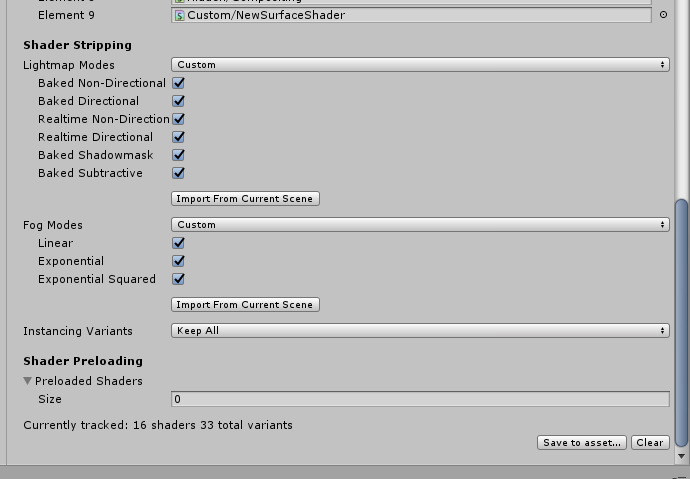 Unity 2018.4.23f1 Android版本,Shader用的是新建的SurfaceShader,Shader Stripping设置如下图。