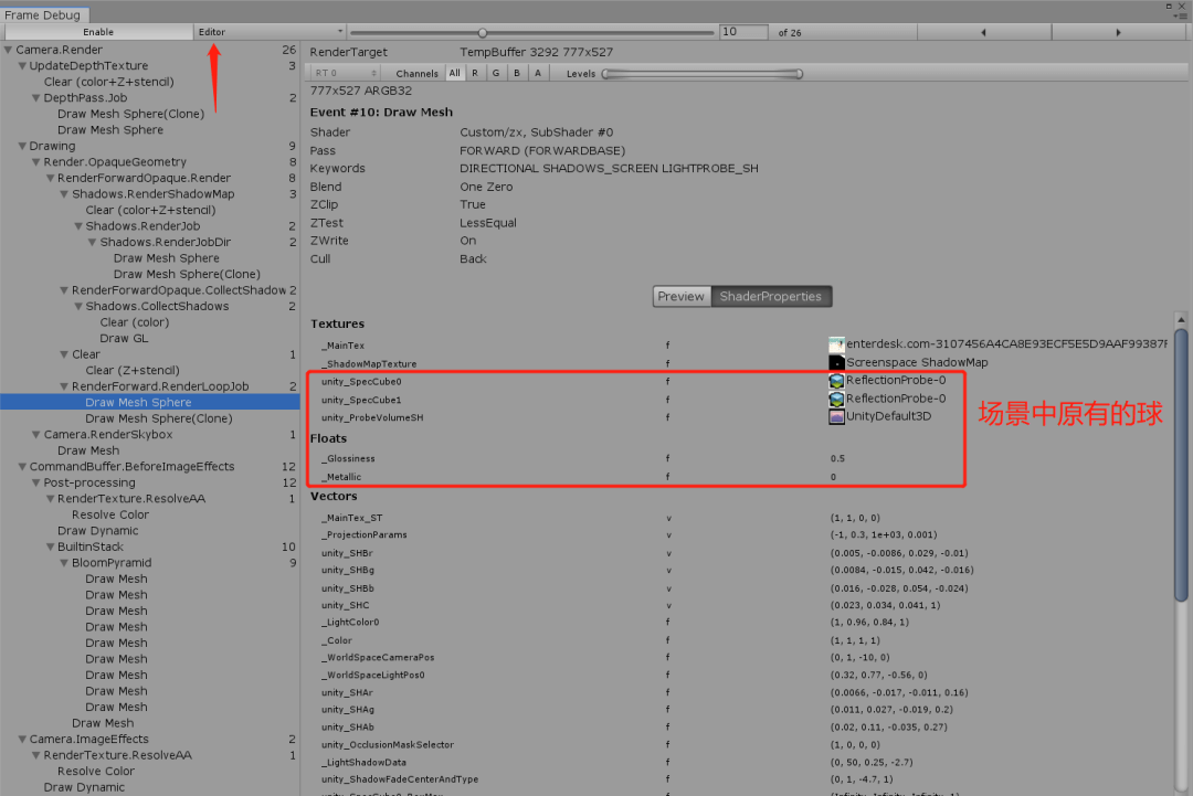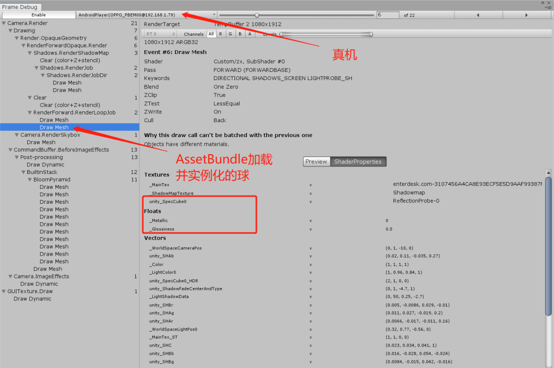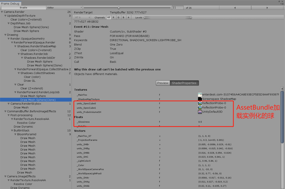 A:打包成APK后连接FrameDebugger看到在场景中的球和AssetBundle加载后实例化的球的Shader参数信息完全是一样的,所以可能是在Android平台Build后的AssetBundle在Editor中加载才会出现楼主所说的问题。