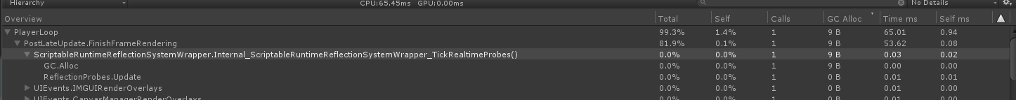 https://unity3d.com/cn/unity/whats-new/2018.3.8Scripting: Removed allocation in every frame from ScriptableRuntimeReflectionSystemWrapper.TickRealtimeProbes. (1097039)