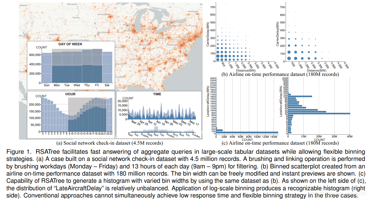 分析师通常会调查从统计数据汇总中得出的数据分布,这些统计汇总由图表(如直方图和合并的散点图)表示,以可视化和分析大型数据集。聚合查询是通过这样的过程隐式执行的。数据集时常会非常大;因此,应通过计算预定义的数据立方体来加快响应时间。但是,查询仅限于预处理数据多维数据集的预定义合并方案。这种局限性阻碍了分析师灵活调整视觉规格,以有效地调查数据中的隐式模式。特别地,RSATree通过利用三种方案来实现任意查询和灵活的分箱策略,这三种方案分别是:基于R树的空间分区方案以捕获数据分布,局部敏感哈希技术以实现对数据项的保留局部性的随机访问以及一个求和的面积表示方案,以线性计算复杂度支持对聚合值的交互式查询。这项研究提出并实现了一个基于Web的可视查询系统,该系统支持视觉规范,查询和用户可调整粒度的大规模表格数据的浏览。我们通过在现实世界的数据集上进行各种实验并分析时间和空间复杂度来证明我们的方法的效率和实用性。