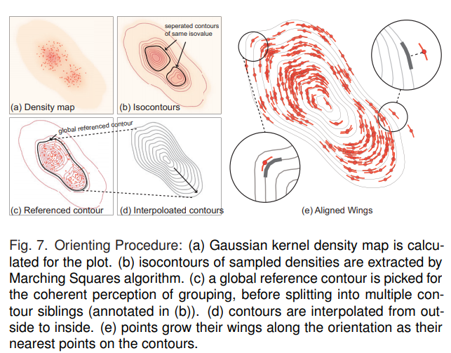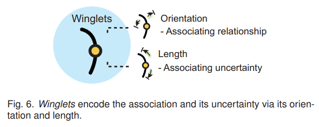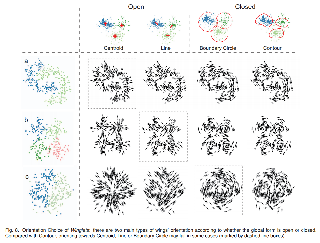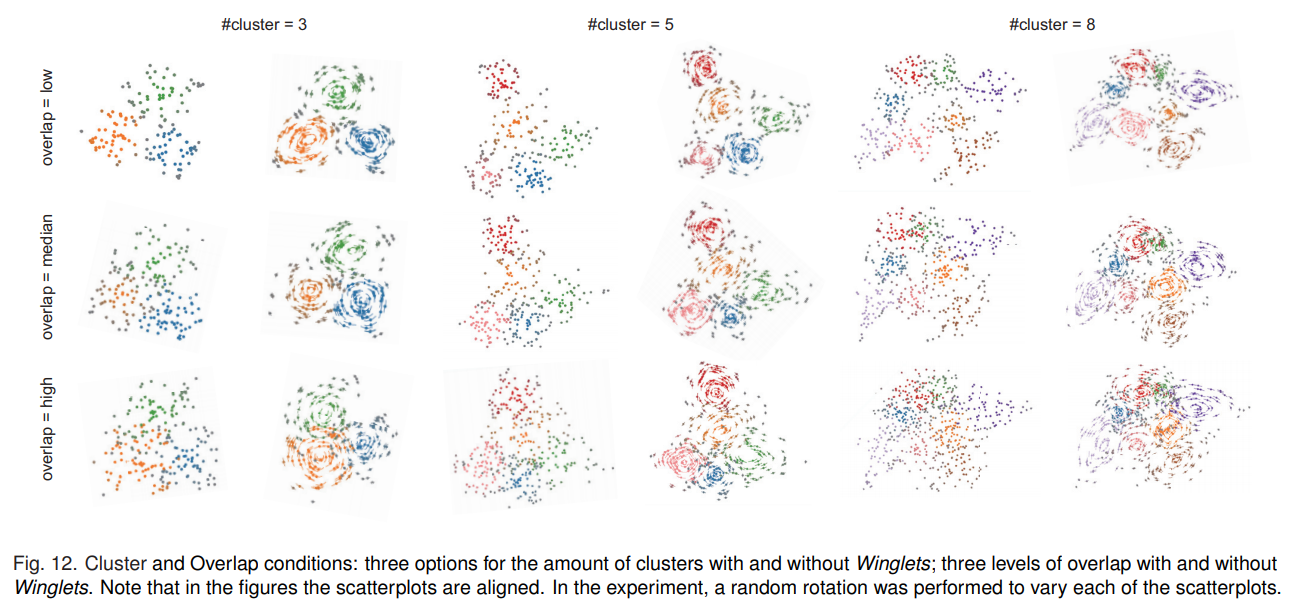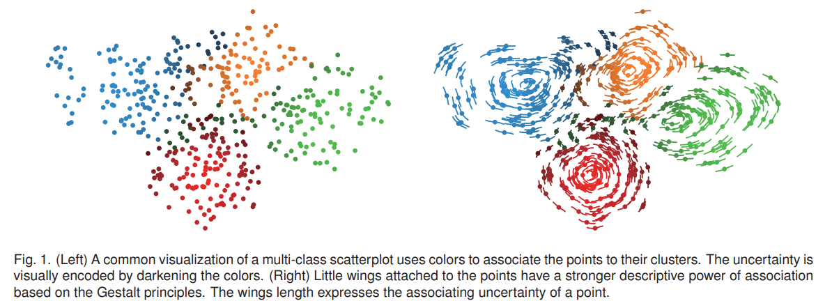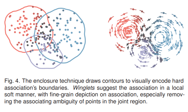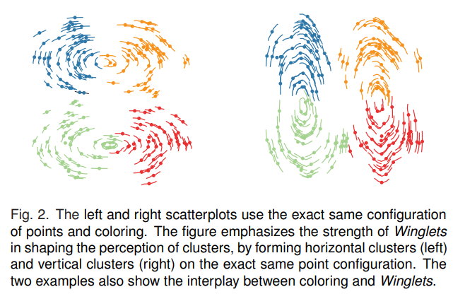 这项工作提出了“小翼”,它是对经典散点图的增强,可以通过改善关联点的感知和与其相关聚类的不确定性来更好地感知多个类别。小翼被设计为属于数据点的一对双向笔划,它利用格式塔的闭合原理来塑造对簇形式的感知,而不是使用显式的除法编码。通过对长度和方向这两个主要属性的微妙设计,小翼使观看者能够对群集进行心理上的补全。通过进行一项受控用户研究,检查了小翼感知聚类关联的效率和某些点的不确定性。结果表明,小翼将点更紧密地关联到聚类中,并改善了关联不确定性的感知。
