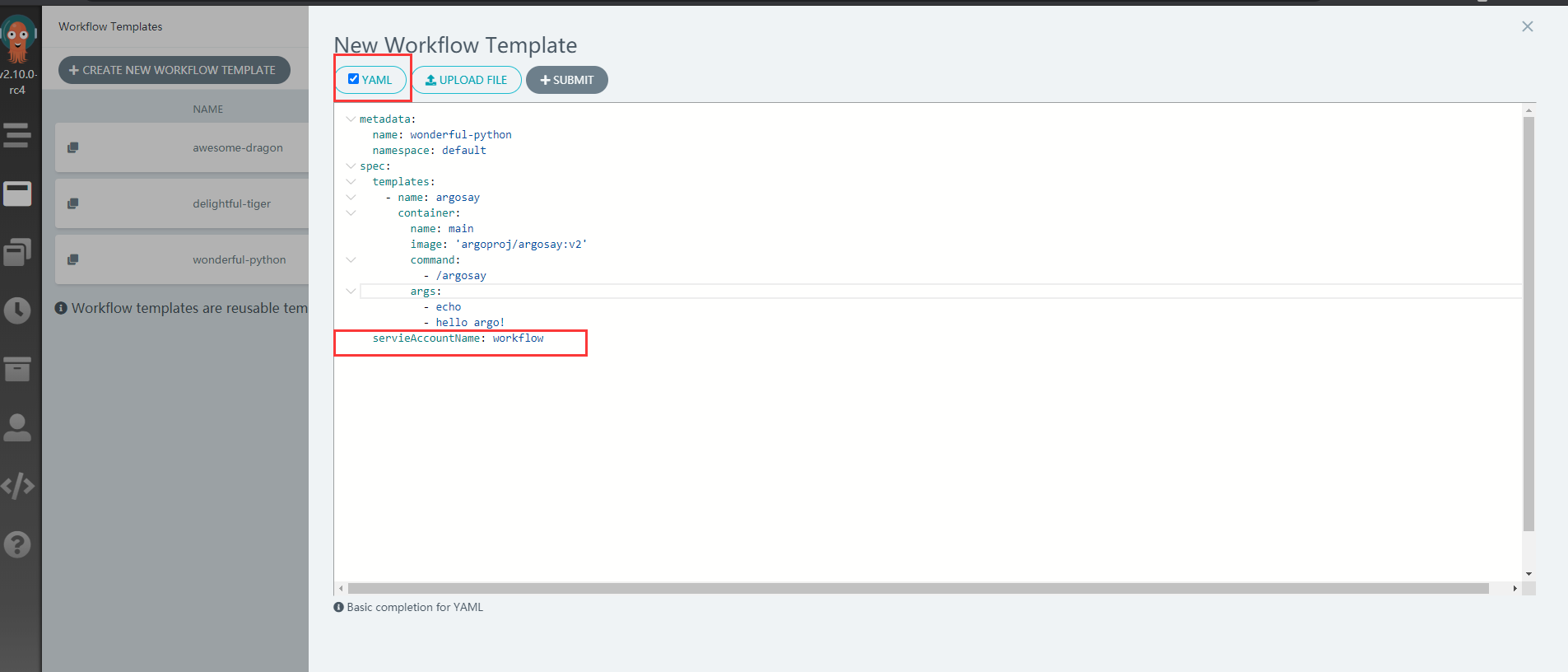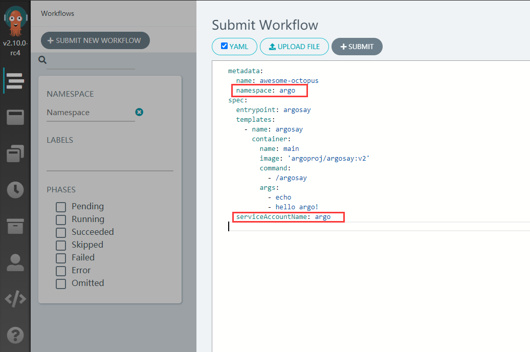 - 需要注意的是namespace选择argo,spec下增加serviceAccountName: argo