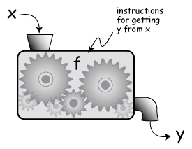 我们习惯性地用xx表示输入值,而用yy来代表输出值,而把这个“机器”把xx“加工”成yy的过程用表示为 y = f(x)y=f(x)
