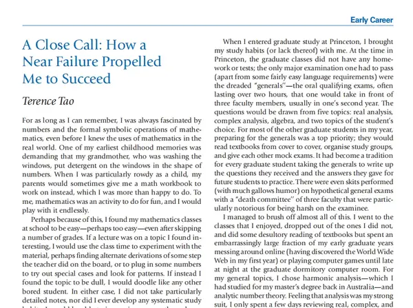 他坐在房间最远的角落里,读着一本叫做《微积分》的精装书。Terence 当时只是一个七岁的小孩子。在见过他的两个兄弟之后,我和 Terence 一起去了他父亲的书房,经过简短的聊天,我开始对这个天赋异禀的小孩进行评估。」