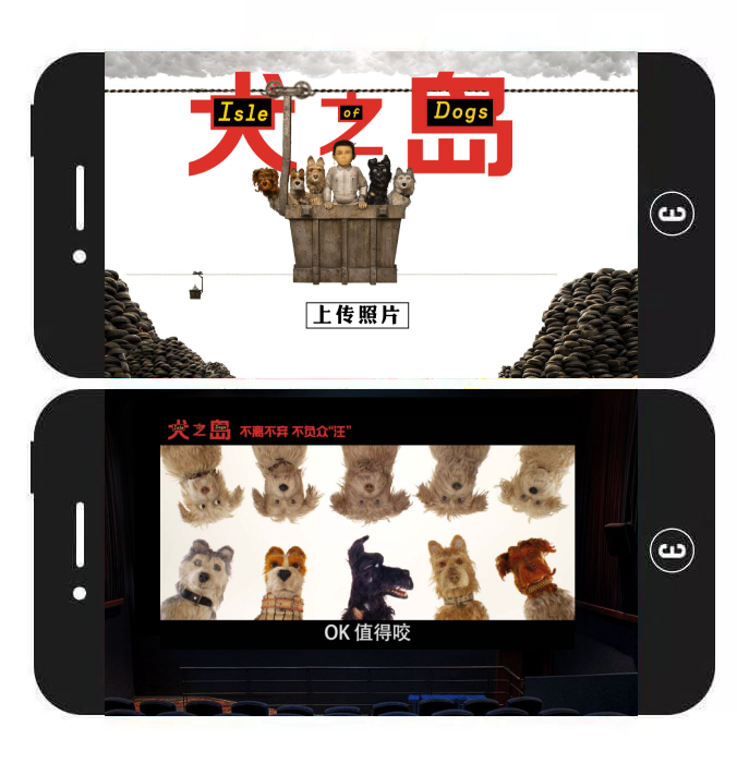 内容特色:用户可先上传一张照片,再观看一段短视频。视频将用户上传的照片与电影《犬之岛》中的片段融合成了一个有趣的短故事。视频观看结束后,用户可根据提示按钮将作品分享出去、再看一遍或跳转至《犬之岛》购票页。