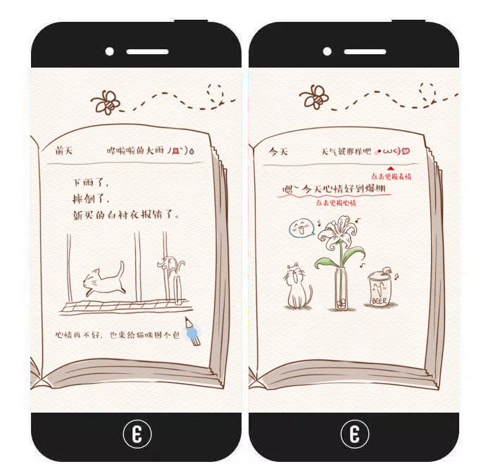 内容特色:该H5主要以“心情日记”为创意出发点。作品共包含3篇心情日记,用户可根据提示通过点击操作给日记中的插画上色或更换日记中的表情、心情。设置完成后,用户可输入文字,并浏览《滚蛋吧!肿瘤君》的预告片。