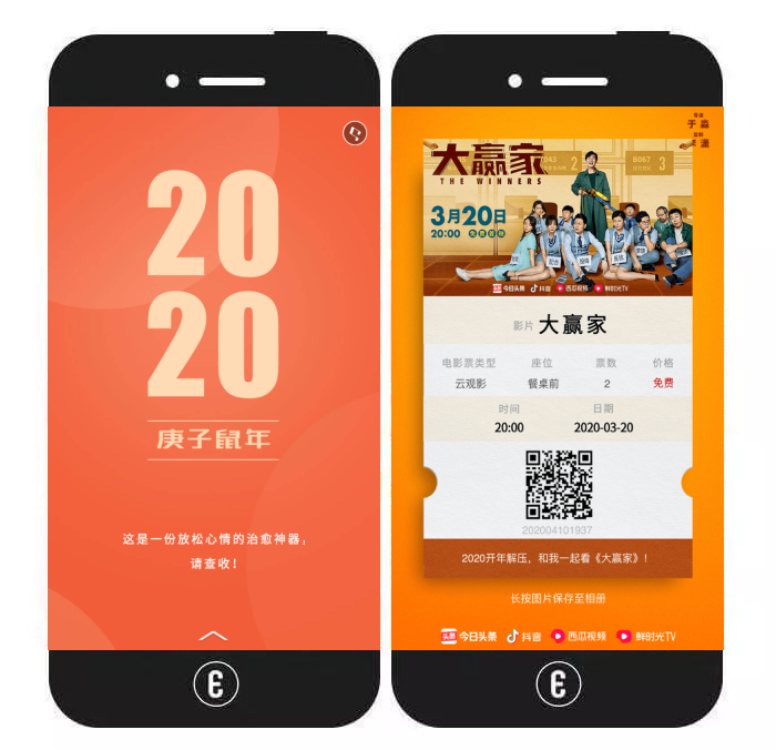 内容特色:作品先以日历的形式向用户阐述受疫情影响被迫宅家的无奈状况,并提出“是时候需要好好放松一下了”,然后引出电影《大赢家》的宣传海报以及后续的交互环节。作品的交互环节以购票场景为主,用户可观看一小段预告片,并根据提示点击购票、选择座位、确定购买数量,以获得一张电影票合成海报。