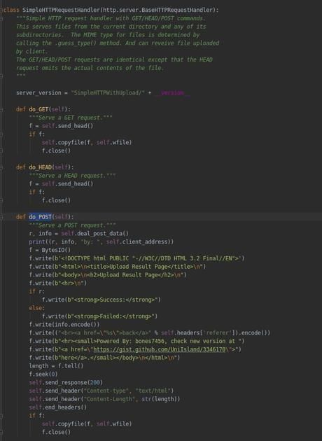 我们已经知道这是 Python 的内置的 http.server ,那么可以继承它,扩展点功能出来,也就是把我们想要的上传功能也给加上去。