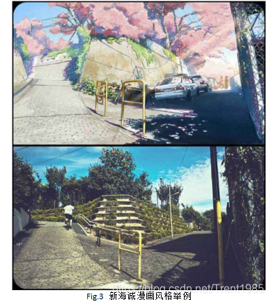 2,颜色单一,一种漫画风格往往使用的颜色数比较少,不会像真实照片中那样包含那么多颜色数,往往只有几种颜色搭配,比如新海诚效果,如图Fig.3所示;