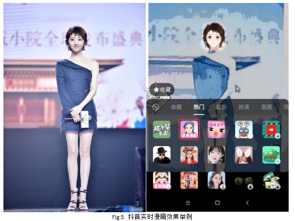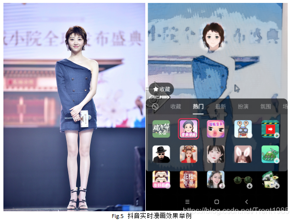 对于抖音的漫画效果,包括两个版本,一个是实时处理版本,也就是抖音上线的第一个版本,如图Fig.1所示,可以实时展示漫画效果;另一个是后来的图片版本,如图Fig.2所示,这个版本更加精细;该功能目前同步上线字节跳动旗下的一些app,比如:抖音/剪映/FaceU等。