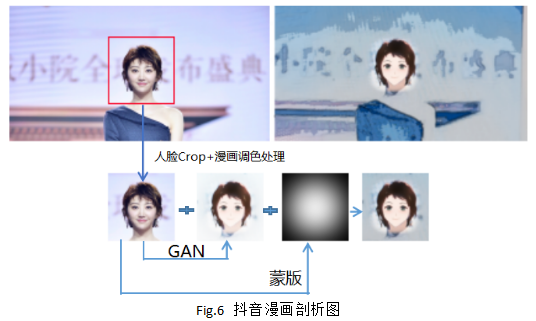 ②使用深度学习技术来生成漫画效果,这一步个人猜测,抖音大概率应该是使用的GAN网络,通过图像直接生成效果,即输入图像A,输出人脸漫画效果图B;