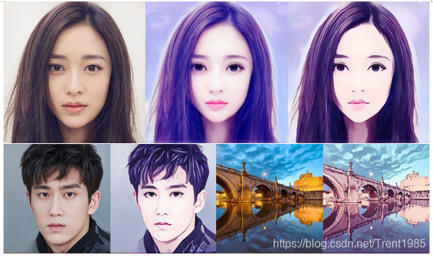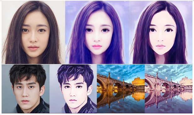 最后,本人使用Pix2Pix做了一些其他风格的漫画特效,如下图所示,左边为原图,其余为效果图。