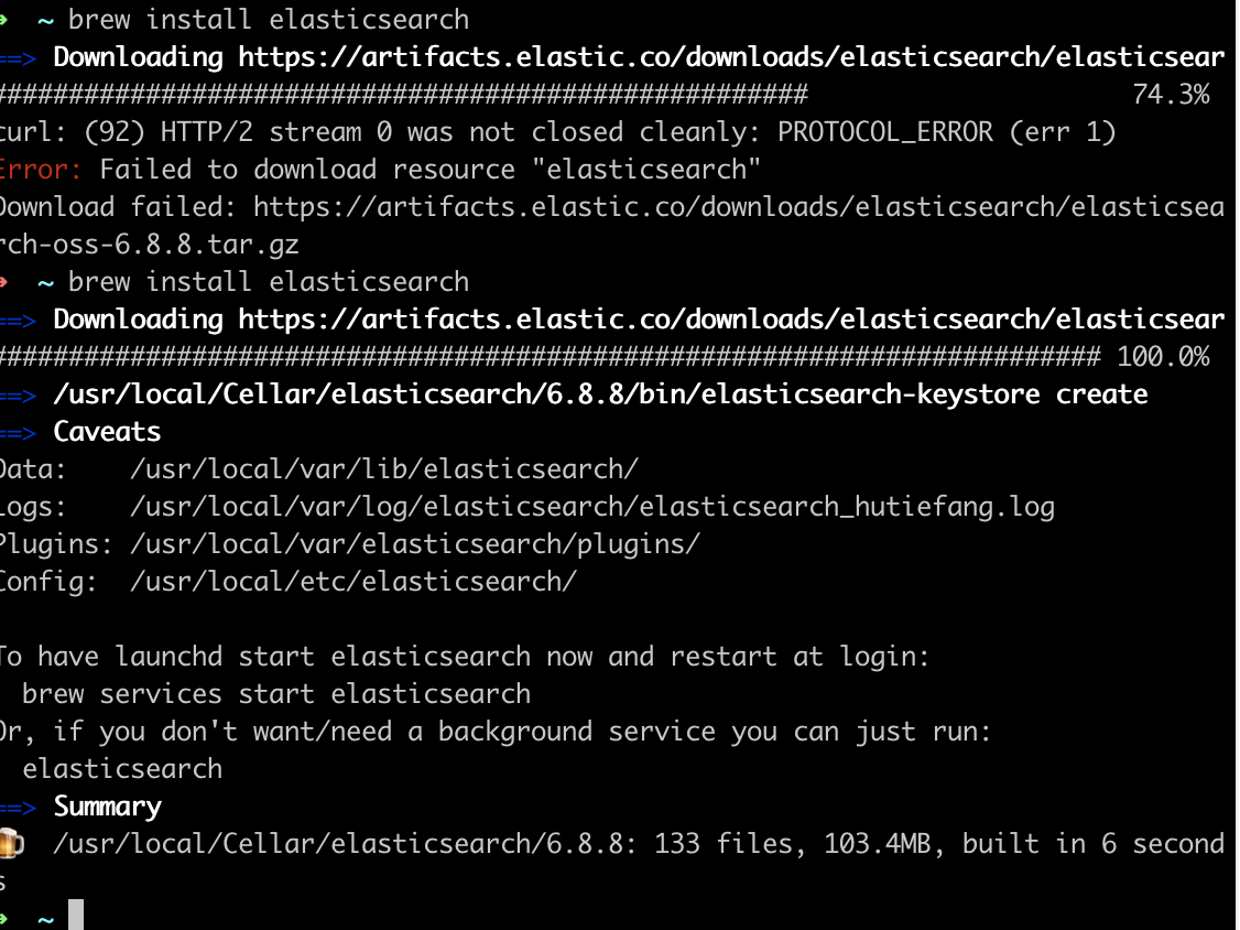 brew install elasticsearch 注意es服务器在国外 下载速度很慢很慢, ,失败了继续失败了继续,我反复了几十次才成功. 来源:oschina链接:https://my.oschina.net/u/3071527/blog/4310592 标签 Elastic homebrew Mac OS X ElasticSearch BREW