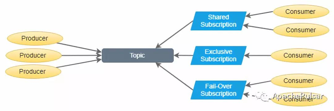 Fail-Over(灾备) - 一个订阅同时只有一个消费者,可以有多个备份消费者。一旦主消费者故障则备份消费者接管。不会出现同时有两个活跃的消费者。