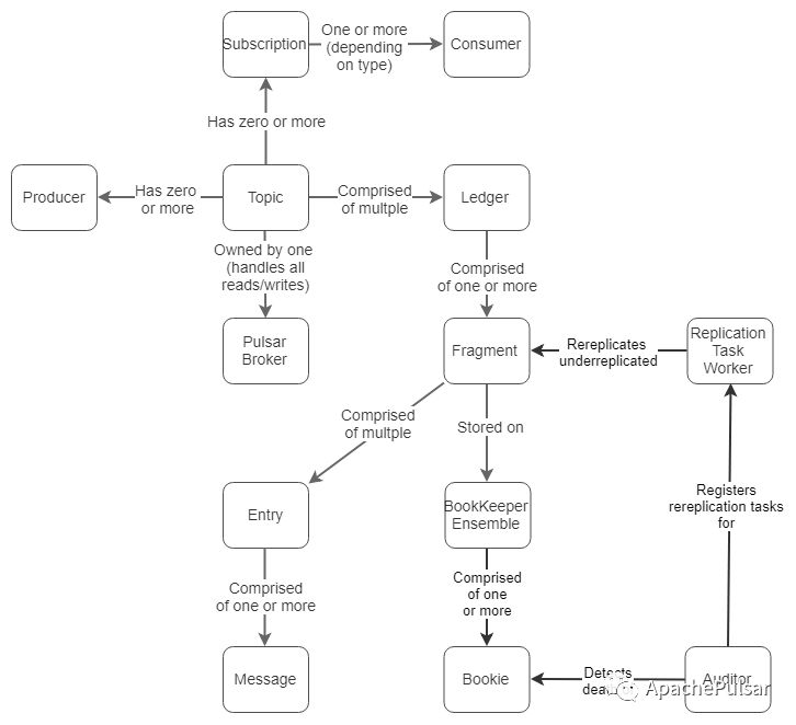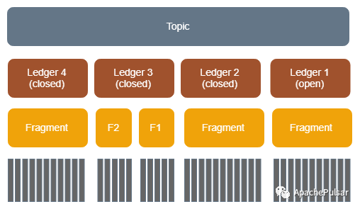 Topic是Pulsar中的概念。Ledger和Fragment是BookKeeper中的概念,尽管Pulsar知道且使用Ledgers和Fragment。