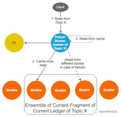 当Broker的缓存中没有消息时将从消息所在的Fragment使用的一个Bookie请求数据。这样可能必须承担额外的网络开销和可能的磁盘读取成本。