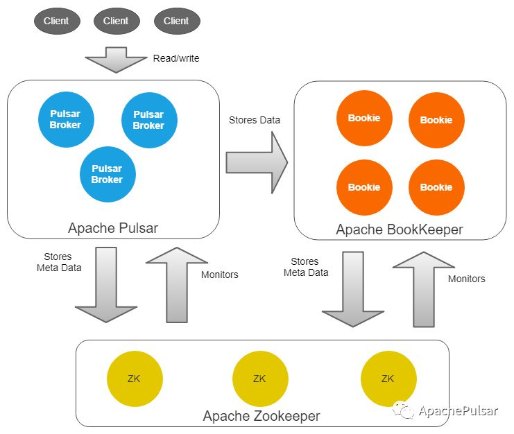 首先,BookKeeper将数据存储至集群中的节点上,每个BookKeeper节点称为Bookie。其次,Pulsar和BookKeeper都使用Apache Zookeeper来存储元数据和监控节点健康状况。