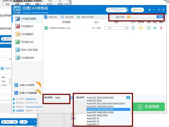 第二步:文件添加后,在软件下方设置文件的输出类型和输出版本,随即修改输出目录,最后点击“批量转换”。