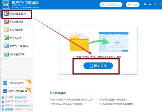 第一步:打开软件后,在软件左侧选择“CAD版本转换”;点击界面中间“添加文件”按钮,添加需要转换的高版本CAD文件。
