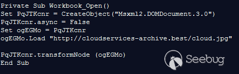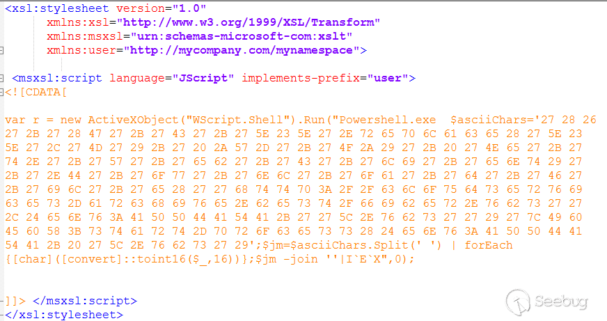 VBS宏代码段与“cloudservices-archive.]best” 域相联系,而且隐藏在图片文件的有效负载中,该有效负载既不是图片也不是可执行文件,它是一个XSL样式的表格,该表格中还包含能加载另一个ActiveX对象的Javascript。