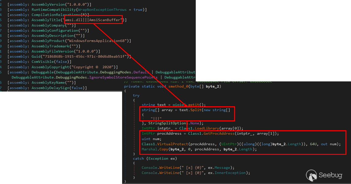 上图显示了该技巧的完成方式:从“Assembly Title”字段检索两个组件“amsi.dll”和“AmsiScanBufer”,将目标方法引用到补丁以避免在运行时检测有效负载。
