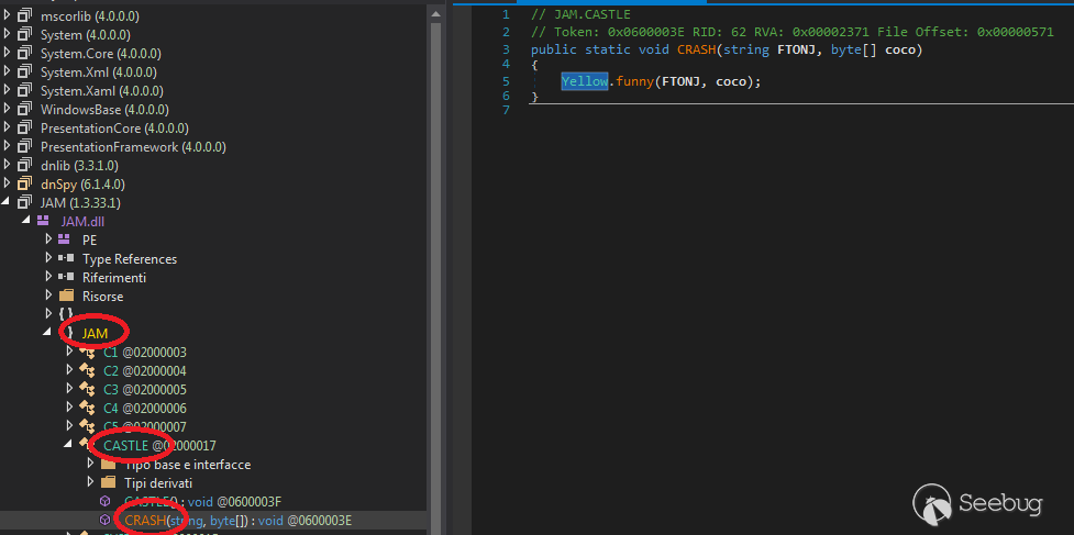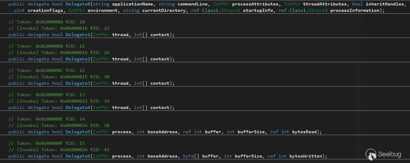 如代码所示,变量 $MNB 在“CASTLE”类中作为调用静态方法“CRASH”的参数传递,而另一个参数主要进行目标进程注入。这个.Net 编译的可执行文件包含许多对攻击者使用的注入方法的引用。部分如下: