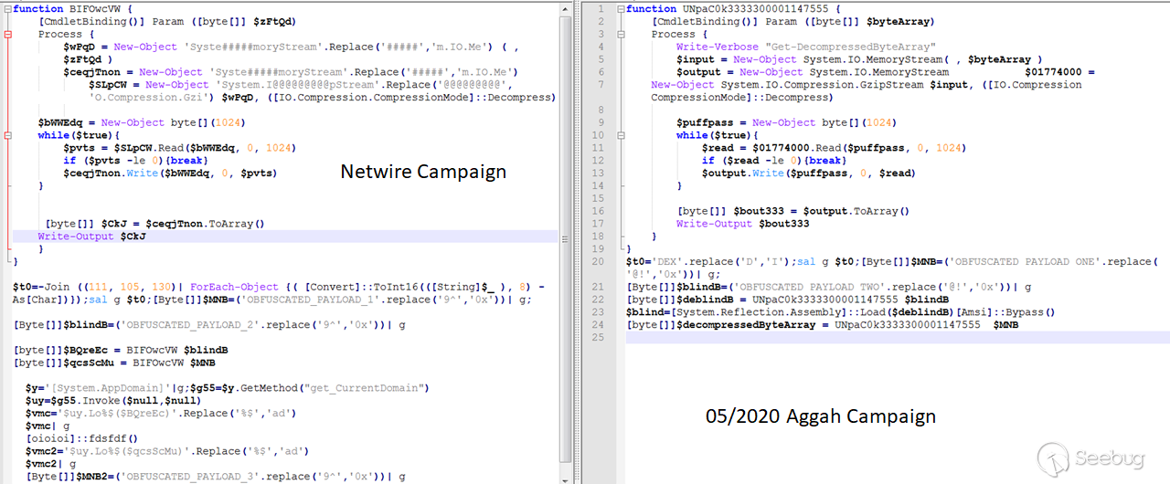 尽管有变量名,但有效载荷的解码功能是相同的,而且,“$MNB”和“blindB”变量也已保存。 这可能也意味着这些技术在某种程度上已经被造成此次意大利事件的黑客们使用,或者说Aggah攻击者们在寻找不同的攻击链。