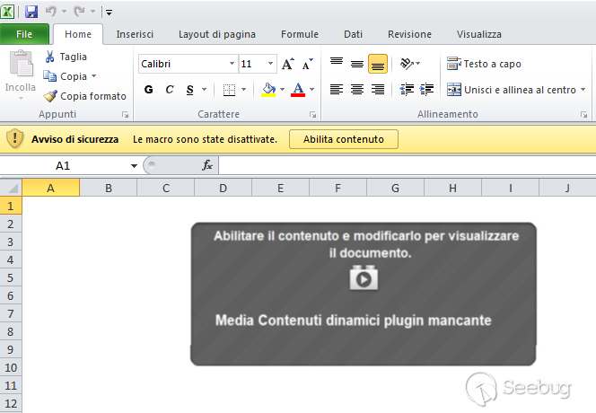 Excel 文档一旦打开便会有一些动态元素显示(但是没有可以点击的按钮),接着就会有安全窗口弹出并告知宏在文档中已经被禁用。