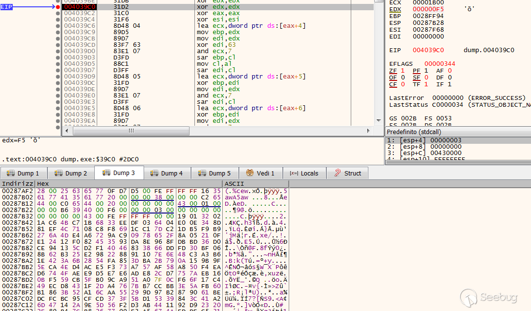 在分析二进制结构时,我们恢复了已配置命令和控制服务器的硬编码IP地址: 185.140.53.] 48. 该地址被滥用,Netwire可执行文件使用自解密例程运行其木马模块,并它分配一个新的内存区域,然后进行代码解密,结果如下图所示: